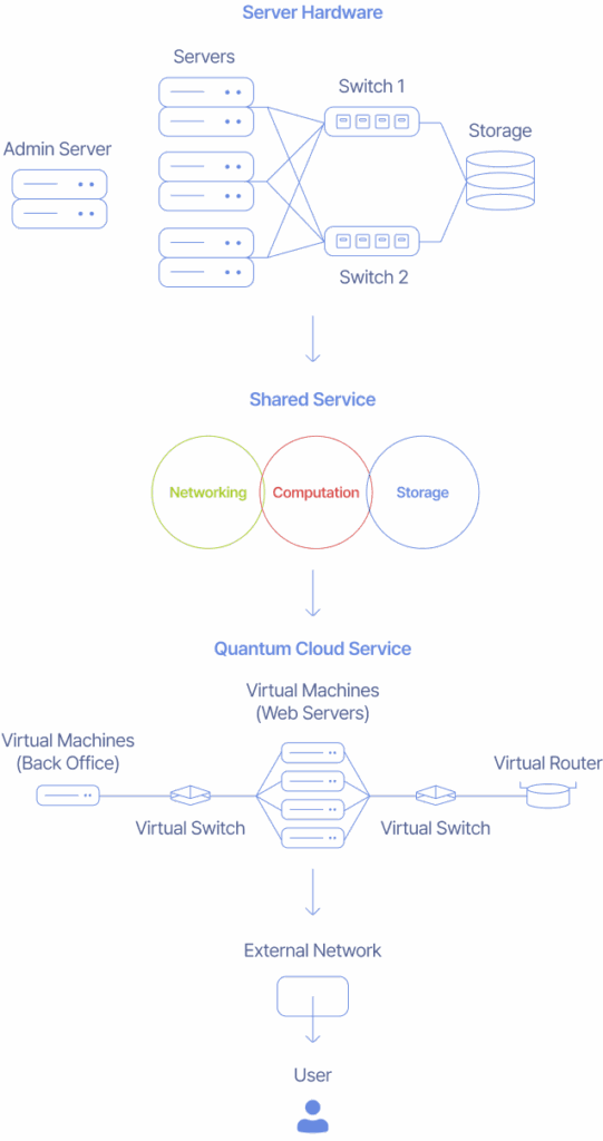 Quantum Cloud Service는 Openstack, Kubernetes, Ceph 등 오픈 소스를 기반으로 자체 개발한 프라이빗 클라우드 플랫폼입니다.