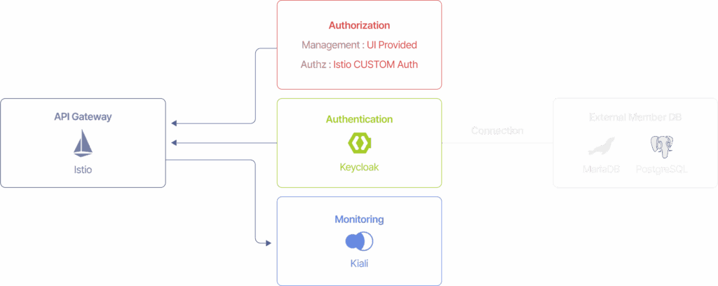 또한, 외부 회원 DB를 연동한 인증 기능, JWT Token Customization 기능, 그리고 SSO 서비스를 제공하며, Authz 모듈은 K8S Operator가 제어합니다.